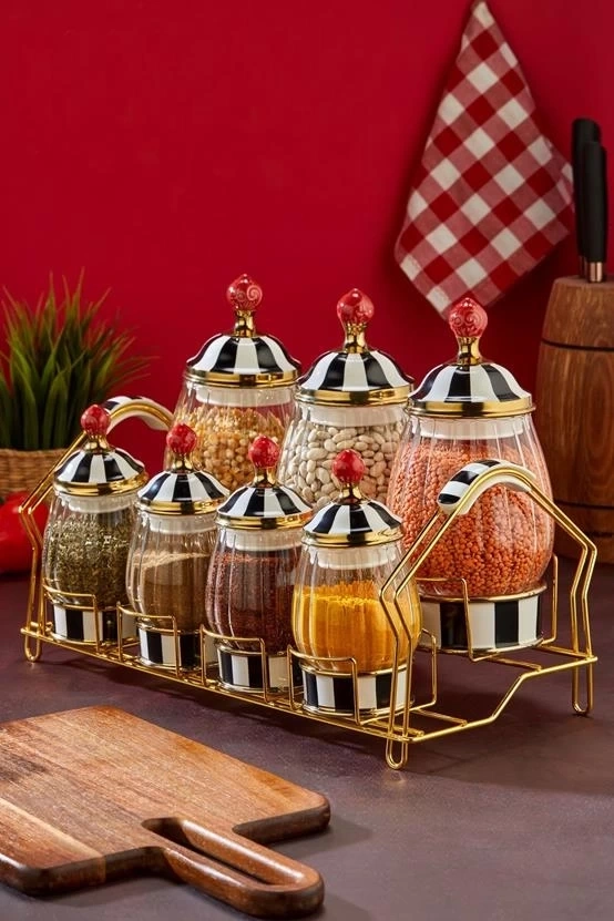 Set içerisinde 7 adet porselen baharat kavanozu bulunur. Siyah-beyaz kapak tasarımı, baharatlarınızı estetik ve fonksiyonel bir şekilde saklamanızı sağlar. Hava geçirmez kapaklar, baharatlarınızın tazeliğini ve aromasını uzun süre korur.
